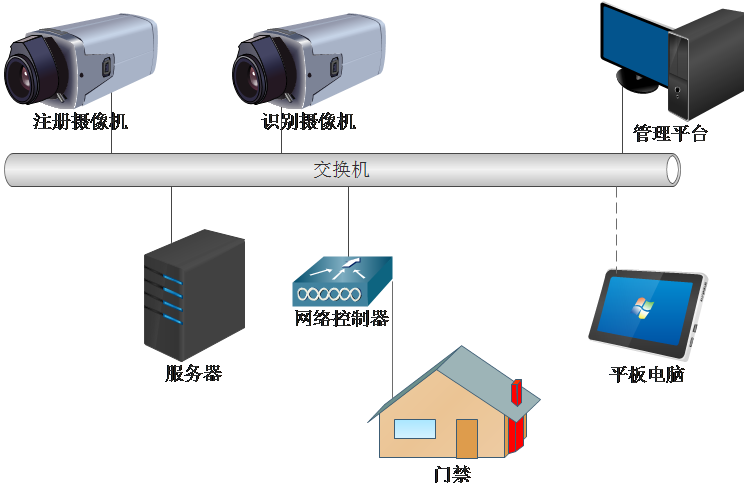动态人脸识别门禁系统主要由摄像机、服务器主机、PC机、安卓平板、网络开关控制器、电控门等几部分组成,系统拓扑图如下所示。